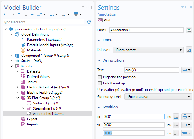 The COMSOL Multiphysics UI showing the Model Builder with the 3D Plot Group 3 selected and the corresponding dropdown menu, with Annotation highlighted. In the Settings window for the Annotation node, in the Text field, type eval(V). This will evaluate and display the local value of the electric potential field. Next, for the Position settings, enter 0.001, 0.002, 0.003 for the x-, y-, and z-coordinates, respectively.