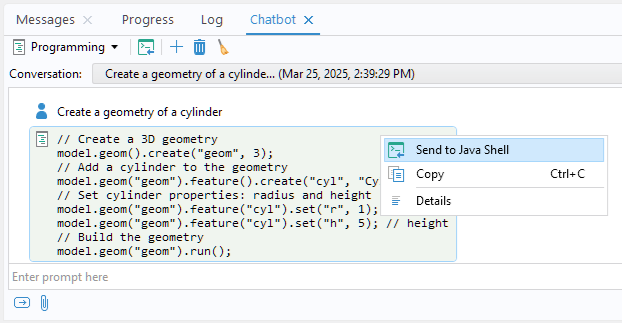 A close-up of the Chatbot window with the prompt set to Create a geometry of a cylinder. Right-click the area with the generated code and select Send to Java Shell.